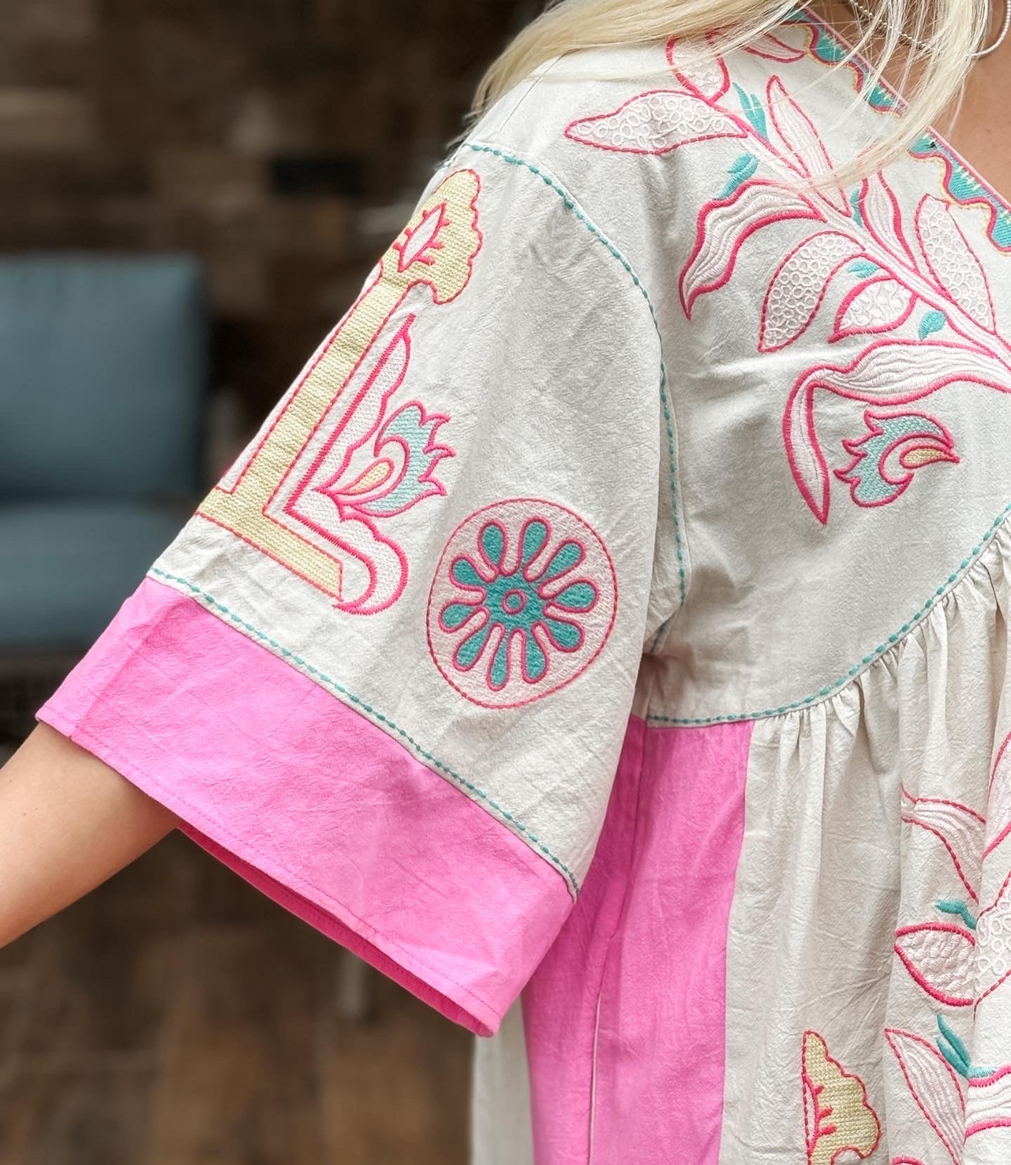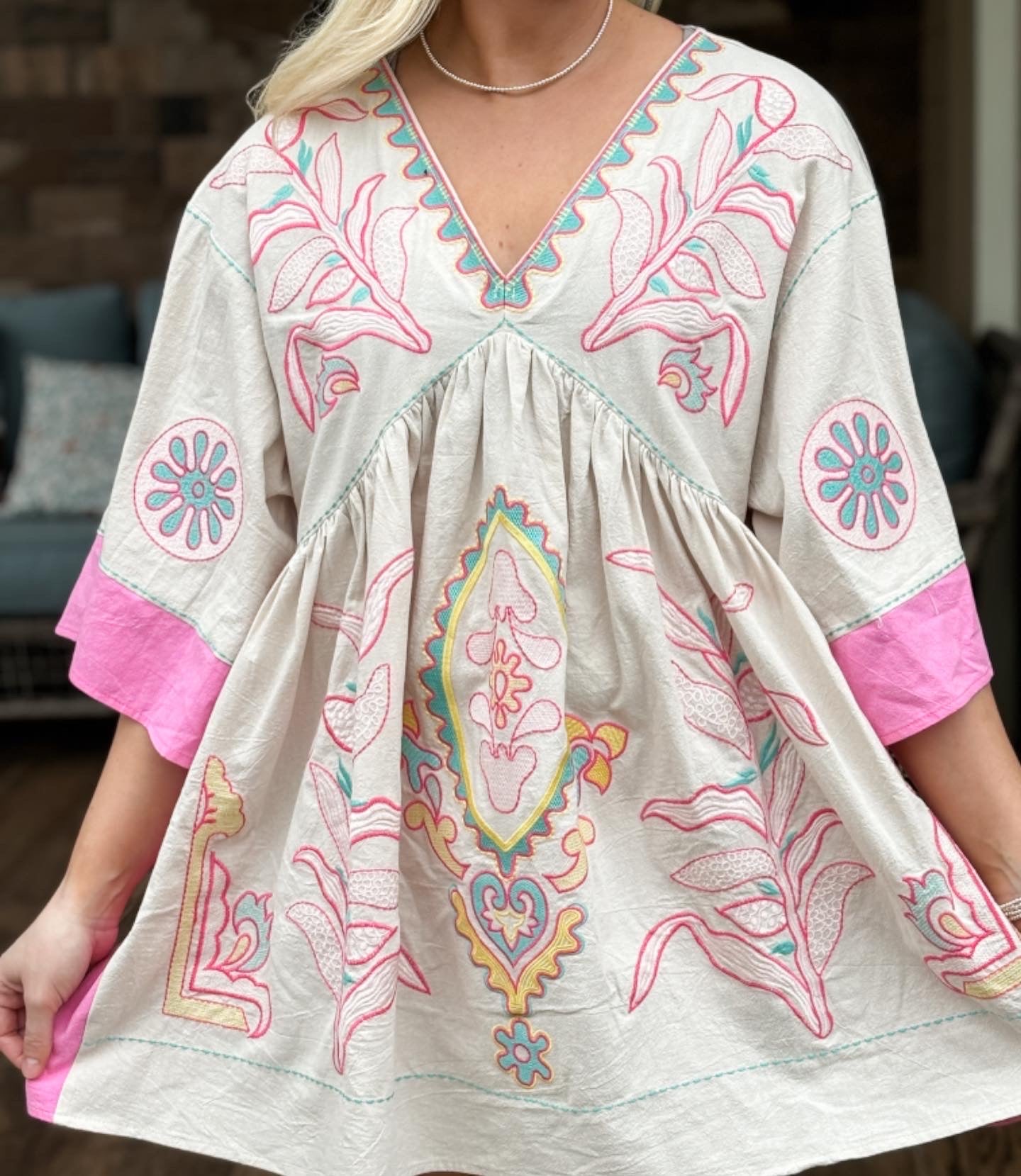Blue velvet pink mix embroidered dress tunic