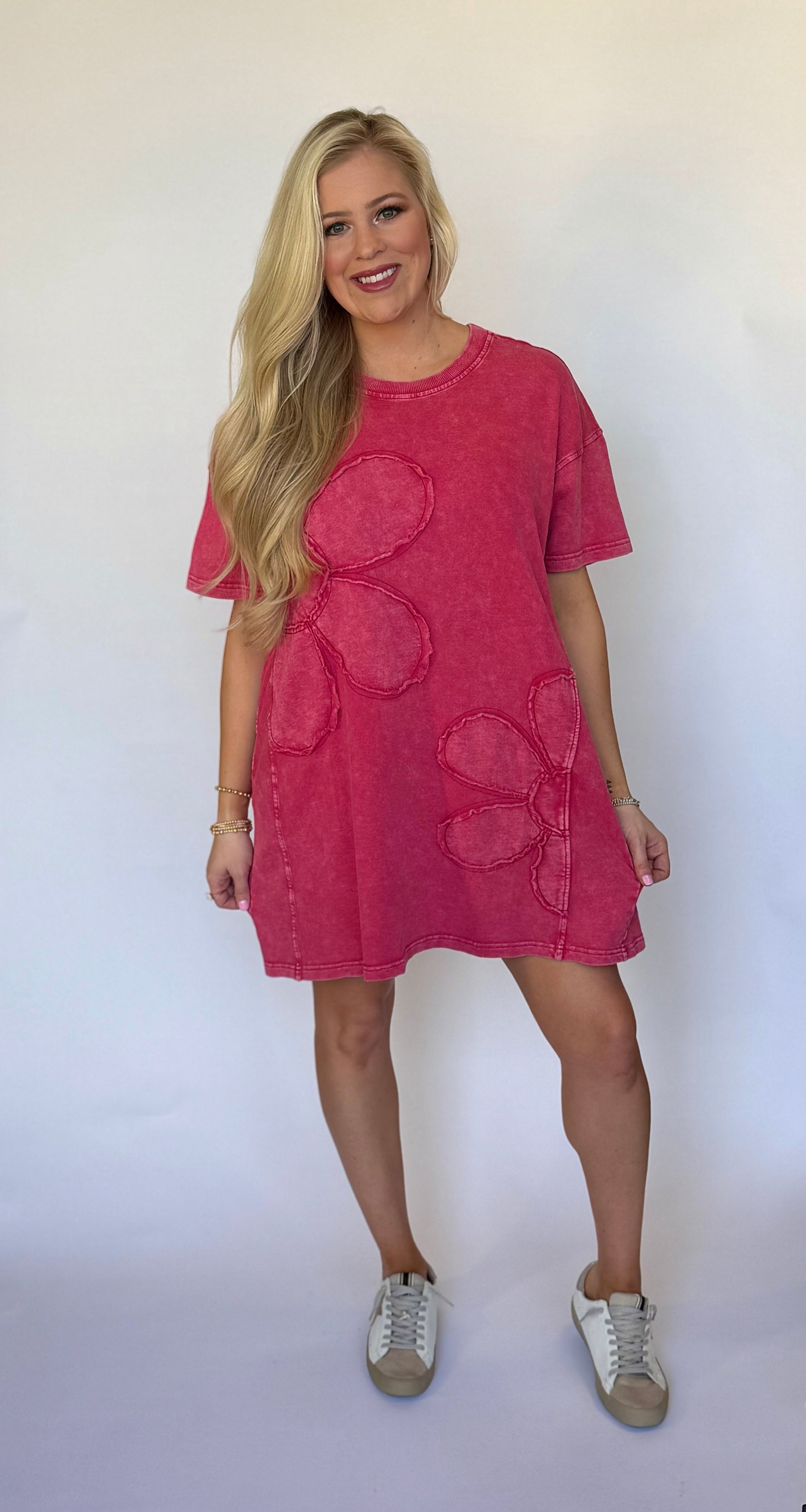 The cutest knit mineral wash T-shirt dress with raised flowers! Light weight and perfect to throw on! True to size model is wearing a size small!