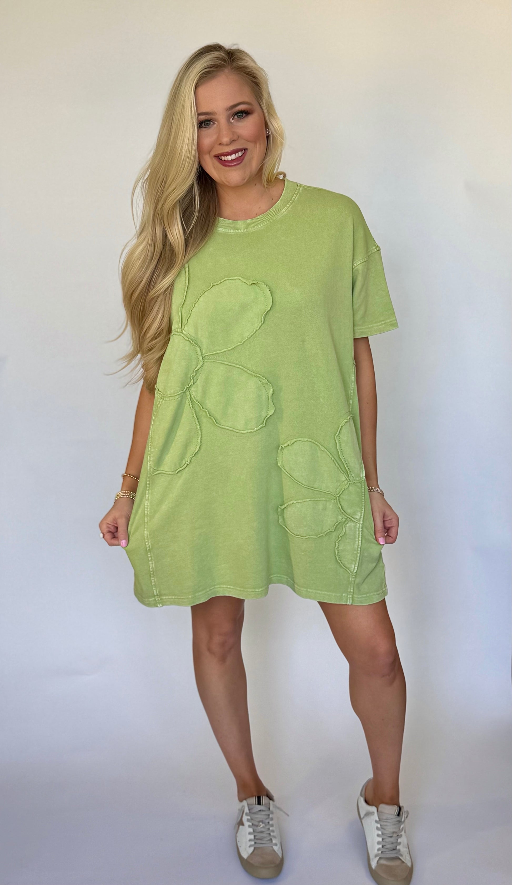 The cutest knit mineral wash T-shirt dress with raised flowers! Light weight and perfect to throw on! True to size model is wearing a size small!