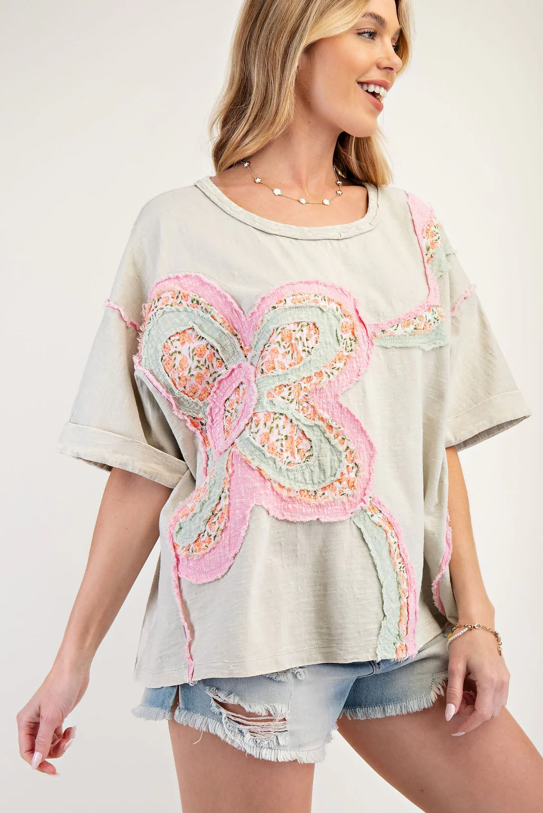 Easel OVERSIZED Top with Mixed Raised Flower Patch in Light Sage