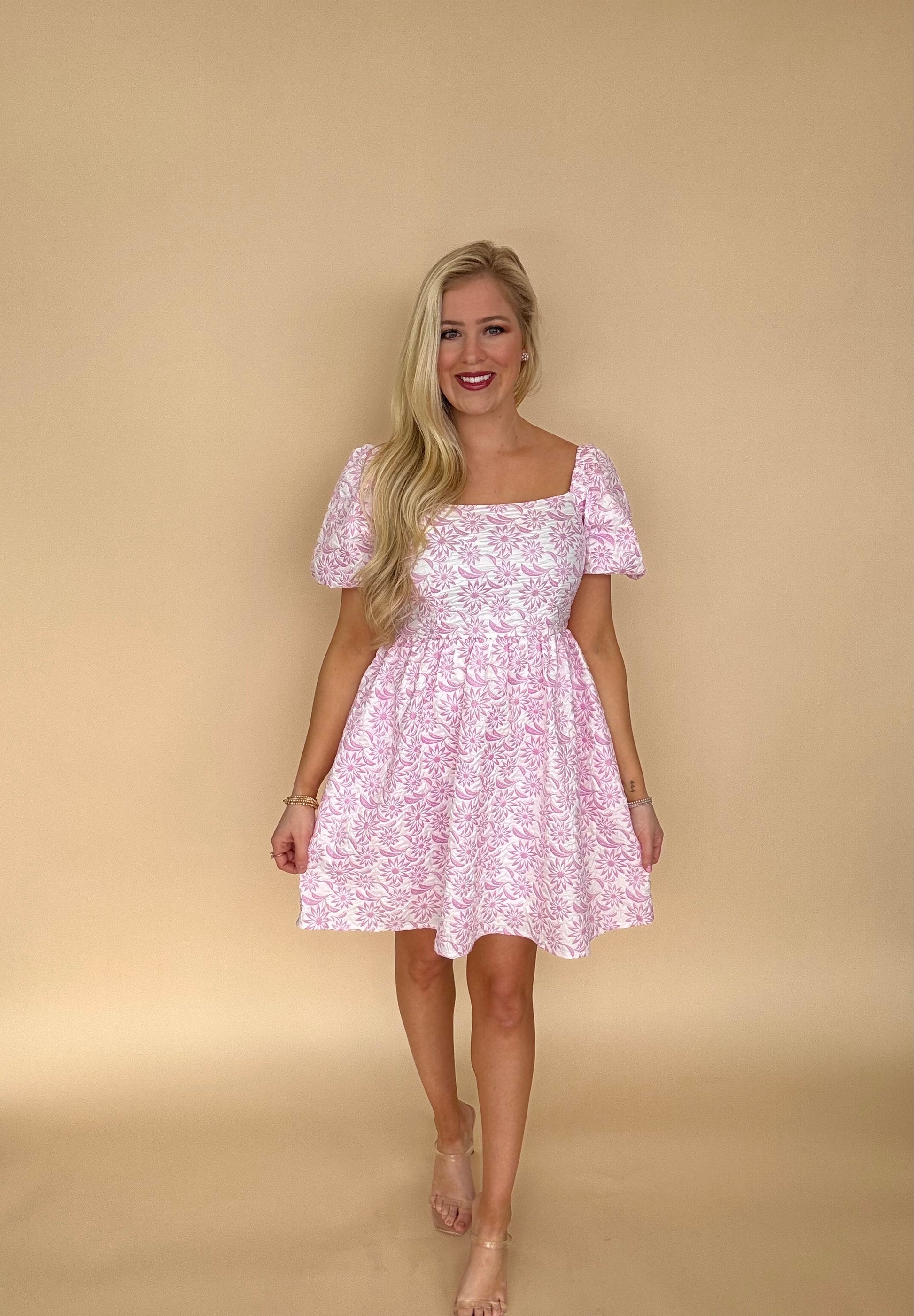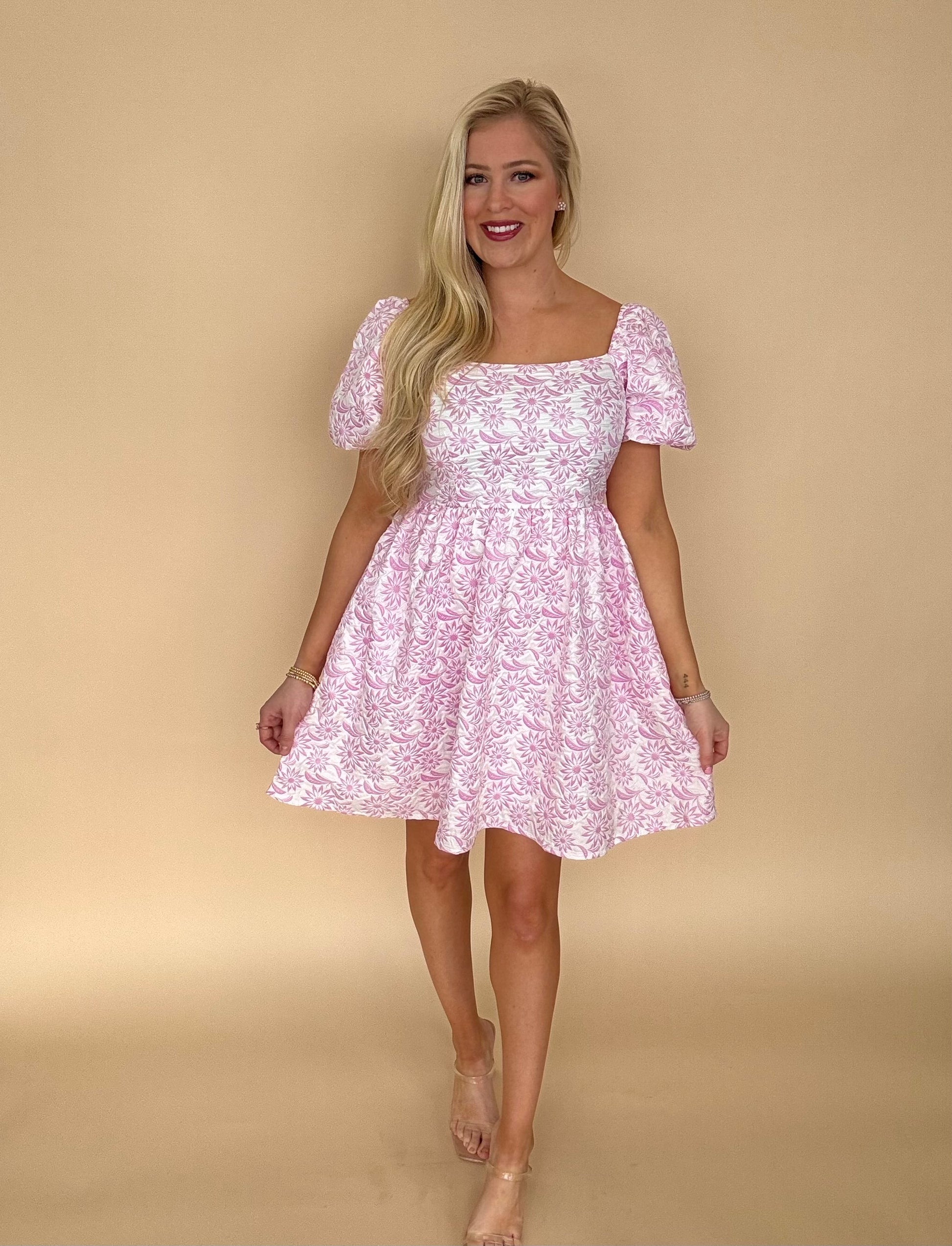 She + Sky Baby pink puff sleeve jaquard dress