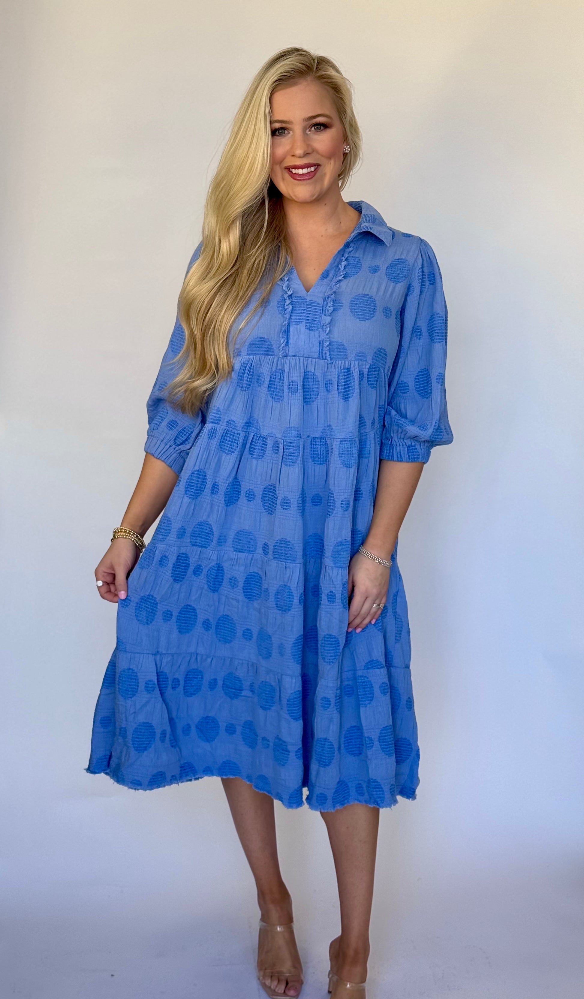 a darling midi dress with textured dots and collared neck line! True to size. Model is wearing a size small!